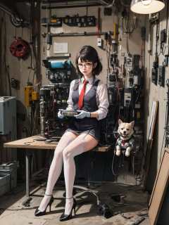cinematic style,realistic,masterpiece,best quality,extremely detailed,absurdres resolution,High quality texture,Cinematic Lighting,1girl Sitting at the table fixing robots,robot dog,cute genius japanese school girl,red necktie, glasses,protective gloves,in a A basement full of neo pipes,welding,precision instruments,complex circuit,vacuum tube punk,high heels,,tututh, ((white thighhighs)), thighhighs, high heels,<lora:tututh_0005:0.65>