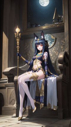 (masterpiece, top quality, best quality, official art, beautiful and aesthetic:1.3), (1girl:1.3), extreme detailed, colorful, highest detailed,((ultra-detailed)), (highly detailed CG illustration), ((an extremely delicate and beautiful)), cinematic light, petite, anubis attire, solo, (abstract art:1), full body, moon, night, ((ancient egyptian theme)), (anubis ears), pyramids, staff, (gold), golden ornaments, ((expressionless)), pharao, hierography, portrait, body tattoo, face tattoo, active pose, over head lighting, fangs, glowing eyes, sitting, relics,,tututh, white thighhighs, thighhighs, <lora:tututh_0005:0.8>