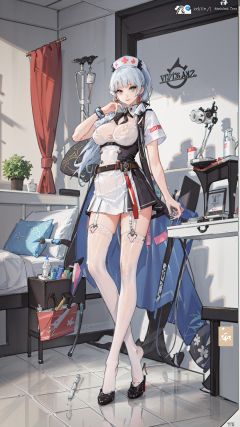 kamisato ayaka (heytea), (high heels),ultra high res, photo, 4k, (photorealistic:1.4), absurdres, solo, (incredible absurdity), ((masterpiece, best quality)), (wallpaper), (8k hd), correct posing, detailed clothing, detailed body, correct body anatomy, (golden ratio:1.2), extremely beautiful and delicate anime face and eyes, minute details, intricate details, delicate, beautiful face, beautiful eyes, layered backgrounds, (gorgeous background), dynamic angle, delicate background, (detailed light),Indoor, hospital, (advanced ward), potted plant, ((hospital bed)), canopy bed, steel frame bed, cabinet, monitor, electronic equipment, ambiguous, bedside table, (id card), (ward), ((medicines:1.3)), ((syringes:1.2)), ((vials:1.2)), ((needles)), (Fluids), (night:1.2), standing, (full body),((1 girl)), (huge breasts:1.3), kamisato ayaka, official alternate costume, ponytail, serafuku, blunt bangs, hair bow, black bow, hair ribbon, red ribbon, (Nurse:1.3), uniform, uniform temptation, badge, (white shirt:1.2), (white miniskirt), white T-shirt, (white pencil skirt), (grey eyes), (light blue hair:1.3), mole under eye, (shine), cute smile,,tututh, white thighhighs, thighhighs, <lora:yetAnotherNahidaGenshin_nahidav3:0.4> <lora:tututh_0005:0.7>