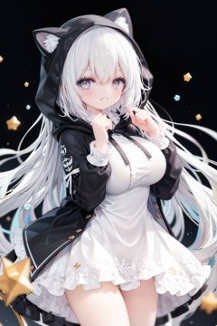 masterpiece, ((best quality)),  dynamic angle, chromatic aberration, ((colorful)),1girl, solo, hood, animal hood, breasts, frills, smile, hood up, yellow eyes, capelet, hair between eyes, blush, dress, long sleeves, looking at viewer, animal ears, large breasts, black ribbon, bangs, puffy long sleeves, :d, frilled dress, hand up, open mouth, white dress, puffy sleeves, hooded capelet, virtual *******r, frilled capelet, fang, white capelet, star (symbol)