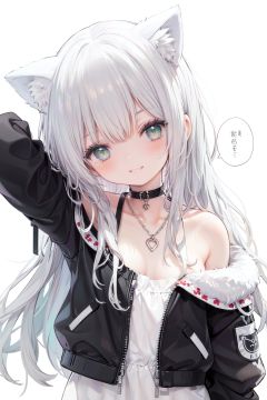 1girl,  solo,  green eyes,  smile,  long hair,  cat ears,  looking at viewer,  animal ears,  white background,  simple background,  bangs,  silver hair,  upper body,  speech bubble,  jacket,  black jacket,  head tilt,  bare shoulders,  eyebrows visible through hair,  off shoulder,  half-closed eyes,  grin,  arm up,  collarbonereflection light