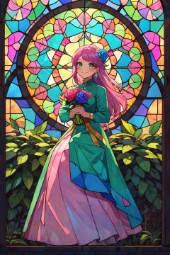 white background, best quality, ((masterpiece)),1girl, rose window, tacoma art glass, solo, long_hair, pink and purple hair, green eyes, smile, long dress, (holding blue flower), yellow_flowe, Putri Duyung Kecil, jewelry, stained_glass, unrays shine upon it,hyper quality, high detail, HD
