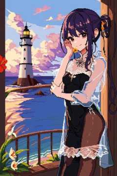 pixel art,masterpiece, best quality,smile,closed mouth,fusion,smelling flower,lighthouse,see-through,hair pulled back,bodystocking,