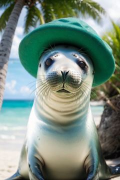 A seal, Surprised expression, Look at the camera real, Professional photography, A group of seals, Beach, Palm tree, Coconut tree, Tropical plants n, Smooth hair, Lovely, Look at the camera., Variant varieties, (Green hat: 1.2), No one, UHD, best quality, 16k