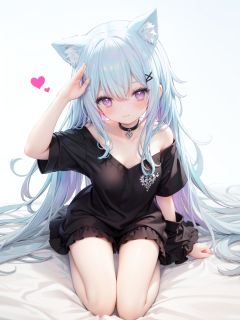 petite, loli, solo, animal ears, heart, puffy short sleeves, blue hair, long hair, off shoulder, bangs, hair ornament, gradient background,rainbow gradient, x hair ornament, animal ear fluff, looking at viewer, very long hair, blush, smile, cat ears, bare shoulders, collarbone, hand up, gradient sweater, hair between eyes, symbol-shaped pupils, arm up, heart-shaped pupils, hairclip, medium breasts, salute, bare legs,full body