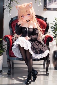 masterpiece, ((best quality)),  dynamic angle, chromatic aberration, ((colorful)),1girl, animal ears, dress, tail, solo, long hair, pantyhose, purple eyes, cat ears, cat, cat girl, cat tail, black dress, white pantyhose, standing, indoors, black footwear, animal ear fluff, looking at viewer, flower, off shoulder, full body, frilled dress, brown hair, long sleeves, blush, bangs, plant, choker, bare shoulders, potted plant, wooden floor, black choker, frills, boots, parted lips, very long hair, animal, blonde hair, chair, bow, collarbone, puffy sleeves, hair between eyes, shoes, black collar