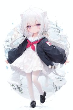 cute,Infant,solo blue shirt,blue sailor coat,loli,full body,white hair,snow leopard ear,white background,pink eyes,laugh,happy,white pantihose,white pantyhose,red armband,