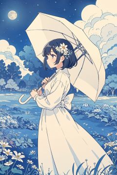 flower, star \(sky\), cloud, umbrella, starry sky, sky, white flower, 1girl, flower field, night, night sky, black hair, dress, holding umbrella, solo, cloudy sky, moon, field