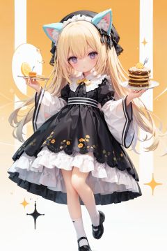 (cinematic lighting),  dreamy atmosphere,  Ray tracing,  (((solo))),  (loli:1.5),  (child:1.5),  (petite:1.5),  green eyes,  (animal ears),  dress,  solo,  food,  blonde hair,  open mouth,  long hair,  pancake,  flower,  holding,  bow,  smile,  fork,  bird,  socks,  looking at viewer,  shoes,  striped background,  holding fork,  bonnet,  striped,  frills,  long sleeves,  :d,  yellow dress,  bangs,  eyebrows visible through hair,  blush,  green nails,  hair bow,  nail polish,  diagonal stripes,  chick,  sparkle,  frilled dress,  orange bow,  fruit,  full body,  :3,  hair between eyes,  green bow,  puffy sleeves,  heart,  lemon,  orange footwear,  animal ear fluff,  white bow,  cat ears,  bobby socks,  orange headwear,  see-through sleeves,  blue background,  striped bow,  hair ornament,  white legwear,  mary janes