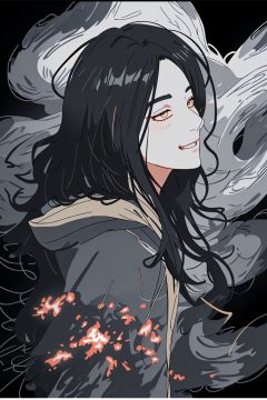 watercolor painting, masterpiece, best quality, 1girl, smile, (wear Hooded down jacket:1), black and golden swirling vortexes black cloudy and smoke and black background, (snowing) (( swirling vortexes black and golden hair)), ((long Hair)), ((right side)), emotional face, close up