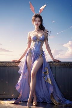fullbody,1girl,(best quality), Nine-headed body,Flattering figure, Masterpiece, best quality, ultra detailed, fine details, ultra high resolution,real skin,white and blue,red lips,Very tight gelcoat,,long leg,Gold and silver, Bunny Girl dress,