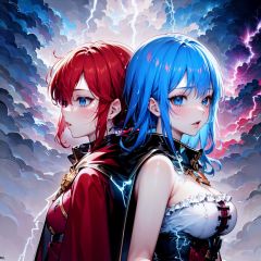 ((best quality)), ((masterpiece)), ((ultra-detailed)), (illustration), (detailed light), (an extremely delicate and beautiful),(cowboy shot),[(confrontation split screen theme)::0.38], (2 girls:1.3)/=(left-side<(girl a<((spread lots of red_Lightning on cape),(spread lots of red Lightning on frills bustier))> and red hair and(Lightning strike and (Electric shock:1.25)))>),(Detailed anime face),glowing pupil,/=(Back to back:1.25),(yuri:0.8),(Lightning-pov:1.3),/=(right-side<(girl b<((spread lots of blue_Lightning on cape),(spread lots of blue Lightning on frills bustier))> and blue hair and (Lightning strike and (Electric shock:1.25)))>),(Detailed anime face),glowing pupil,/=(night sky background),(cloudy sky),((electricity)),((wind)),Depth of Field,best-lighting,volumetric-light,