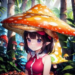 (monsterification:1.3), (1 giant mushroom_girl, wearing Spotted dress, spotted mushroom hair), (spotted mushroom hat:1.2), (upper body), (cute face), beautiful eyes
