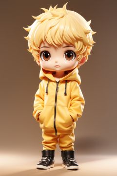<lora:sen_20230918104202:0.9>,ssen,blonde hair,1boy,solo,yellow eyes,male focus,chibi,looking at viewer,hood,standing,full body,zipper,arms at sides,brown background,boots,hoodie,jacket,long sleeves,siblings, smile, sitting, freckles, red eyes, chibi, short hair, blonde hair, looking at another, white hair, blush
