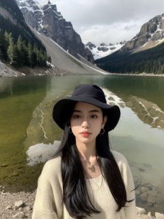 1girl, solo, hat, jewelry, long hair, realistic, black hair, earrings, outdoors, photo background, mountain, necklace, river, looking at viewer, lake, day, nature, upper body, black eyes, lips, a woman with long hair wearing a hat and a backpack near a lake and mountains with snow on the tops