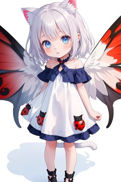 (little loli:1.3), (Cat ears: 1.2), (Cat Tail: 1.2), (Fluffy cat's claw: 1.5) (child:1.2), (Girlish body type), (masterpiece), Exquisite visuals, high-definition, (ultra detailed), finely detail, ((solo)), ((gawr gura)), (medium hair), (white Silver hair), (gradient Blue), (beautiful detailed eyes), Kawai, loveliness, off shoulder, looking at viewer, bare shoulders, standing, ((full body)), pale skin, Best Quality (Ladybug Wings: 1.5), (Cat Beard: 2.0)