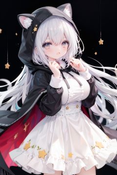 masterpiece, ((best quality)), dynamic angle, chromatic aberration, ((colorful)),1girl, solo, hood, animal hood, breasts, frills, smile, hood up, yellow eyes, capelet, hair between eyes, blush, dress, long sleeves, looking at viewer, animal ears, large breasts, black ribbon, bangs, puffy long sleeves, :d, frilled dress, hand up, open mouth, white dress, puffy sleeves, hooded capelet, virtual *******r, frilled capelet, fang, white capelet, star (symbol)