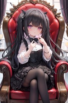 masterpiece, ((best quality)), (ultra-detailed), (illustration), an extremely delicate and beautiful girl, dynamic angle, chromatic aberration, ((colorful)),//,1girls,loli,(petite child:1.1),//,(in Gothic castle),girl with black hair,red eyes,Vertical pupil,long hair,hair arrangement,(Detailed face description),(batwing),(Gothic Lolita),(bat tail),alccandlestick,Cathedral glass,,short skirt,black pantyhose,red lace,high heels,rose tattoo,throne,sitting,crossed legs,//,