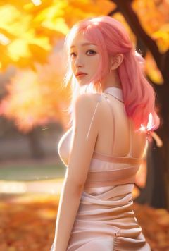 zhangzhenren,Masterpiece,realistic,best quality,1girl,ginger dress,pink hair,pelvic curtain,maple_leaf,in autumn,warm-toned,the sun shines through the shade,blusher,medium breasts,cool expression,looking towards the camera,