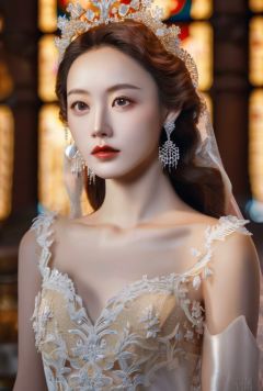 zhangzhenren,textured skin,Masterpiece,realistic,best quality,1girl,(mature female:0.5),tall body,golden proportions,(Kpop idol),(shiny skin:1.2),(oil skin:1.1),makeup,(close up),(church background),depth of field,(closed mouth:0.5),((long wavy brown hair)),(puffy eyes),(eyelashes:1.1),(parted lips:1.1),red lipstick,fantasy art style,dreamy light,(lace wedding dress:1.2),full body,(dreamy veil:1.1),(dusk:1.2),princess shoes,(diamond necklace),(crystal hairpin),tyndall effect,highres,