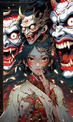 anime artwork ((masterpiece)),((best quality)),8k,high detailed,ultra-detailed,intricate detail,huapighost,(full shot:2),bare foot,long dress,an eerie transformation of beauty and horror,(siting on a bench before a dresser with a bronze mirror),(sitting before bronze mirror:1.2),demon painting the maiden's face with sinister intent,(unveiling:1.1) the (demonic:1.1) visage beneath the rubbery mask,A chilling amalgamation of two faces,one with pale rubbery skin being unveiled,the other with grotesque and decaying features,(terror:1.2),(beauty:0.8),(sinister:1.1),(agonizing:1.1),Captivating and unsettling,Traditional Asian setting,Muted color palette with flashes of red and gold,Asymmetric composition,(ancient scroll:1.2) adorning the background,Soft,diffused light creating dramatic contrasts,<lora:huapighost:1>, . anime style, key visual, vibrant, studio anime, highly detailed
