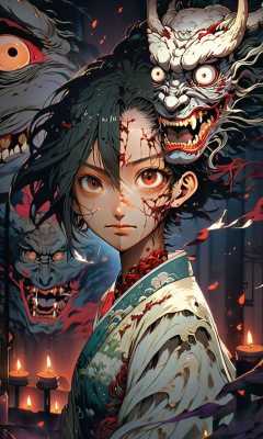 anime artwork anime artwork ((masterpiece)),((best quality)),8k,high detailed,ultra-detailed,intricate detail,((huapighost)),close-up,1girl,Chinese folklore,a dimly lit chamber where a demonic entity unveils its grotesque form beneath a stolen human visage,(terrifying and grotesque),Flickering candlelight casting eerie shadows,(shadows of deceit),Haunting and nightmarish atmosphere,muted tones and stark contrasts,Asymmetric composition,Unreal Engine rendering,capturing the horror of the revelation,<lora:huapighost:1>, . anime style, key visual, vibrant, studio anime, highly detailed