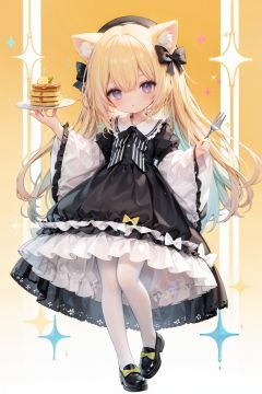 (cinematic lighting),  dreamy atmosphere,  Ray tracing,  (((solo))),  (loli:1.5),  (child:1.5),  (petite:1.5),  green eyes,  (animal ears),  dress,  solo,  food,  blonde hair,  open mouth,  long hair,  pancake,  flower,  holding,  bow,  smile,  fork,  bird,  socks,  looking at viewer,  shoes,  striped background,  holding fork,  bonnet,  striped,  frills,  long sleeves,  :d,  yellow dress,  bangs,  eyebrows visible through hair,  blush,  green nails,  hair bow,  nail polish,  diagonal stripes,  chick,  sparkle,  frilled dress,  orange bow,  fruit,  full body,  :3,  hair between eyes,  green bow,  puffy sleeves,  heart,  lemon,  orange footwear,  animal ear fluff,  white bow,  cat ears,  bobby socks,  orange headwear,  see-through sleeves,  blue background,  striped bow,  hair ornament,  white legwear,  mary janes
