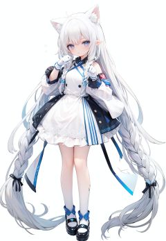 1girl, white_gloves, braid, full_body, gloves, long_hair, official_alternate_costume, pointy_ears, simple_background, solo, standing, very_long_hair, white_background,white hair,blue eyes,paw claw pose, open_mouth,