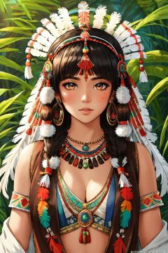 (((best quality))),(((highly detailed))),(((masterpiece))),(((ultra-detailed))),(((illustration))),(((extremely detailed))),((exciting)), Native Indian, 1 Indian girl, whole body, (((Indian feather headdress))), Indian necklace, delicate and beautiful face, graffiti on the face, beautiful eyes, watercolor, splash ink, brown crystal eyes, highlight, tropical plants, macaws, highlight, rich pictures, ultra clear, perfect, high-definition, 8k