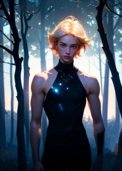 Masterpiece,best quality,ultra high resolution,1 male, in the sun,charming eyes,high shine,red-yellow tones,(bare shoulders:1.2),shiny hair,shiny skin,unique cut,blue forest,mysterious darkness,black starlight clothing,transparent texture,dreamy particles,black eye,black pupil,