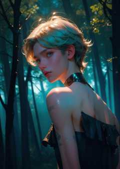 Masterpiece,best quality,ultra high resolution,1 male, in the sun,charming eyes,high shine,blue-green tones,(bare shoulders:1.2),shiny hair,shiny skin,unique cut,blue forest,mysterious darkness,black starlight clothing,transparent texture,dreamy particles,black eye,black pupil,