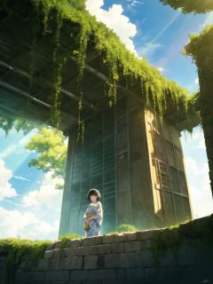 1girl,black border,black hair,blue sky,building,cloudy sky,day,light rays,no humans,outdoors,overgrown,ruins,scenery,short hair,signature,sky,standing,sunbeam,tree,white shirt,yukata ,<lora:ABC-000008:0.7>,
