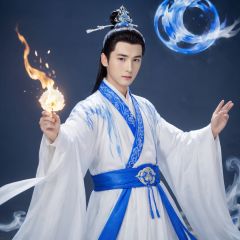 masterpiece, 1 boy, Hanfu, Use fire magic, Flame element, Fantasy art, Flying sparks, The background is Magic Array.,True Love,blue and white porcelain