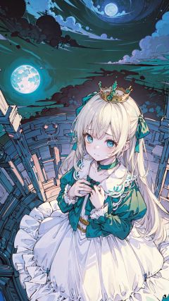 (turn pale, sad, scared, closed mouth:1.2), (dark night and sky, green moonlight top of view:1.5),