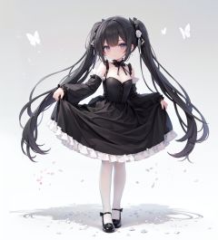 masterpiece, ((best quality)),  dynamic angle, chromatic aberration, ((colorful)),1girl, solo, black hair, long hair, dress, butterfly, bug, twintails, black footwear, lolita fashion, very long hair, pantyhose, black dress, long sleeves, bow, full body, bangs, flower, puffy sleeves, standing on one leg, shoes, white pantyhose, hair bow, looking at viewer, grey eyes, frills, standing, gothic lolita, blush, juliet sleeves, black bow, frilled dress, white flower, rose, closed mouth, skirt hold, petals, wide sleeves, mary janes, white rose
