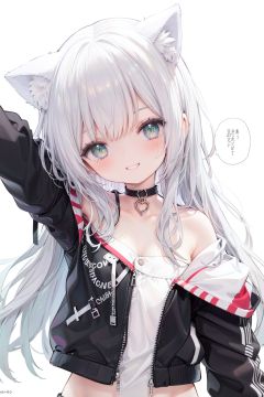 1girl,  solo,  green eyes,  smile,  long hair,  cat ears,  looking at viewer,  animal ears,  white background,  simple background,  bangs,  silver hair,  upper body,  speech bubble,  jacket,  black jacket,  head tilt,  bare shoulders,  eyebrows visible through hair,  off shoulder,  half-closed eyes,  grin,  arm up,  collarbonereflection light