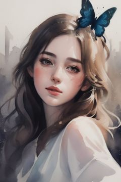 (8k, best quality, masterpiece:1.2),(best quality:1.0), (ultra highres:1.0), watercolor, a beautiful woman, shoulder, hair ribbons, by agnes cecile, half body portrait, extremely luminous bright design, pastel colors, (ink:1.3), autumn lights, watercolor, ((butterfly)),watercolor