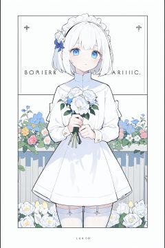 ((white theme:1.75)),((best quality)),((masterpiece)),((ultra-detailed)),(illustration),(detailed light),(an extremely delicate and beautiful),incredibly_absurdres,(glowing),(1girl:1.7),solo,a beautiful girl,(((cowboy shot))),standding,((Hosiery)),((beautiful dress+stocking):1.25),((Belts)),(leg loops),((flower headdress)),((short white hair)),(((beautiful blue eyes))),((english text)),(flower:1.65),(rose),(garden),(((border:1.75))),cozy animation scenes,