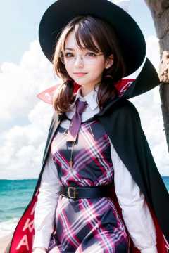 masterpiece, best quality,<lora:SumirekoUsami:1>,usami sumireko, 1girl,hat,hat bow, brown hair,low twintails,glasses,brown eyes,cape,boo tie,plaid vest,shirt,plaid skirt,long sleeves,  clothes writing,bolo tie, smile,outdoors,ocean