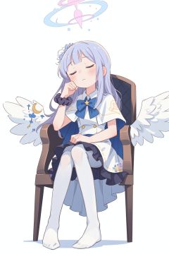 Masterpiece,best quality,high-rise,1 girl,from below,foot focus,medium chest,empty eyes,annoying face,((white pantyhose)),sitting in a chair,A simple background,aamika,halo,long hair,hair flower,angel wings,white wings,low wings,crescent,capelet,blue bow,frills,white dress,wrist scrunchie,white pantyhose,<lora:misono_mika_v1:0.5>,