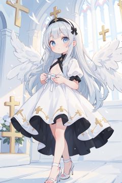 ((masterpiece:1.4, best quality))+,(ultra detailed:1.3)+,(ultra detailed eyes:1.4),(cute 1girl),15 years old,((silver hair)),(very long hair:1.3),closed mouth,(She was wearing a pure white gown made of feather:1.2),pale skin,(depth of field:1.4),(gothic lolita:0.6),((light blue eyes)),(white church background:1.3),(huge white wings:1.3),(flat chest:1.3),((huge wings)),(white high heels:1.2),(a girl in the church),(white and black simple background),((beautiful detailed eyes)),