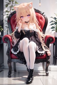 masterpiece, ((best quality)),  dynamic angle, chromatic aberration, ((colorful)),1girl, animal ears, dress, tail, solo, long hair, pantyhose, purple eyes, cat ears, cat, cat girl, cat tail, black dress, white pantyhose, standing, indoors, black footwear, animal ear fluff, looking at viewer, flower, off shoulder, full body, frilled dress, brown hair, long sleeves, blush, bangs, plant, choker, bare shoulders, potted plant, wooden floor, black choker, frills, boots, parted lips, very long hair, animal, blonde hair, chair, bow, collarbone, puffy sleeves, hair between eyes, shoes, black collar