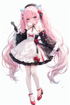 masterpiece, ((best quality)),  dynamic angle, chromatic aberration, ((colorful)),1girl, solo, flower, thighhighs, white thighhighs, gloves, red footwear, long hair, detached sleeves, animal ears, rose, blonde hair, looking at viewer, full body, hat, high heels, petals, dress, standing, twintails, wide sleeves, holding, shoes, frills, red flower, cat ears, bangs, microphone, long sleeves, white flower, hair ornament, white gloves, zettai ryouiki, bare shoulders, pink eyes, frilled dress, small breasts, breasts, closed mouth, skirt, beret, white headwear, very long hair, red eyes, red rose, white dress, blush, ribbon, black gloves, animal ear fluff, hair flower, pink flower