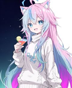 NLP,anime,2d,cowboy shot, masterpiece,Splash color, soft lighting,(cocktail glass), 1girl, solo, cat ears, multicolored hair, ((gradient hair), white+(blue)+(pink:0.5) hair//), very long hair, messy hair, bangs, ahoge, ((gradient eyes), pink+light_blue eyes//), slit pupils, glowing eyes, 1fang, white sweater,