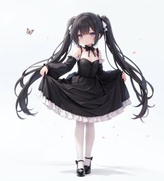 masterpiece, ((best quality)),  dynamic angle, chromatic aberration, ((colorful)),1girl, solo, black hair, long hair, dress, butterfly, bug, twintails, black footwear, lolita fashion, very long hair, pantyhose, black dress, long sleeves, bow, full body, bangs, flower, puffy sleeves, standing on one leg, shoes, white pantyhose, hair bow, looking at viewer, grey eyes, frills, standing, gothic lolita, blush, juliet sleeves, black bow, frilled dress, white flower, rose, closed mouth, skirt hold, petals, wide sleeves, mary janes, white rose