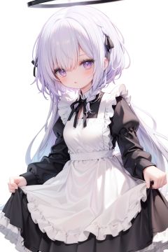 1girl,  solo,  apron,  long hair,  hair over one eye,  white background,  frills,  braid,  halo,  long sleeves,  dress,  simple background,  white hair,  white apron,  puffy sleeves,  very long hair,  frilled apron,  maid,  purple eyes,  ribbon,  parted lips,  maid apron,  bangs,  juliet sleeves,  black dress,  neck ribbon,  looking at viewer,  single braid,  blush
