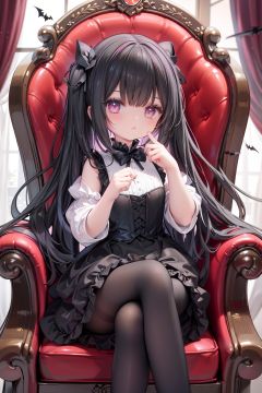 masterpiece, ((best quality)), (ultra-detailed), (illustration), an extremely delicate and beautiful girl, dynamic angle, chromatic aberration, ((colorful)),//,1girls,loli,(petite child:1.1),//,(in Gothic castle),girl with black hair,red eyes,Vertical pupil,long hair,hair arrangement,(Detailed face description),(batwing),(Gothic Lolita),(bat tail),alccandlestick,Cathedral glass,,short skirt,black pantyhose,red lace,high heels,rose tattoo,throne,sitting,crossed legs,//,