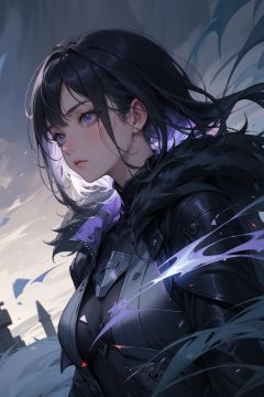 best quality,(masterpiece:1.3),full body, ultra-detailed,solo,1girl, portrait, solo, upper body, detailed background, detailed face, (sinister dark fantasy theme:1.1), Light Zerg Purple northern warrior,  stoic expression,  dynamic pose, furs,  surrounded by magical glow,   cold, windy background, frozen natural landscape in background low light, dark night, epic atmosphere,(36:0.01)