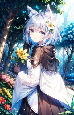 (masterpiece:1.2), high_quality ,occultism, Aestheticism Painting , (flat color), best quality, soft lighting, (depth_of_field:1.3),(solo:1.4), [close-up], (1girl), detailed beautiful blue eyes, (silvery hair) , wolf_ears, short_hair,archbishop_robe ,largr_sleeve, grey_cloak, blooming, looking_at_viewer, lily (flower) , blue butterfly, (fantastic colorful),fluorescence, (forest:1.25), tree_shade, (flowers meadows:1.4), flower, leaves, looking back, cute_fang, black gloves, long scarf,