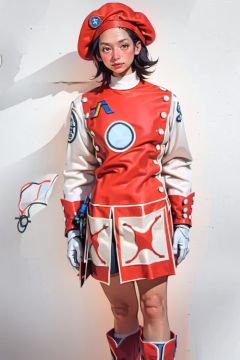 (masterpiece:1.3), (the best quality:1.2), (super fine illustrations:1.2), (Masterpiece), high quality, high detail,((white background:1.2)), looking at viewer, (SOLO:1.4),outline,,simple background,  dress, red shirt, white footwear, hat, boots, red headwear,